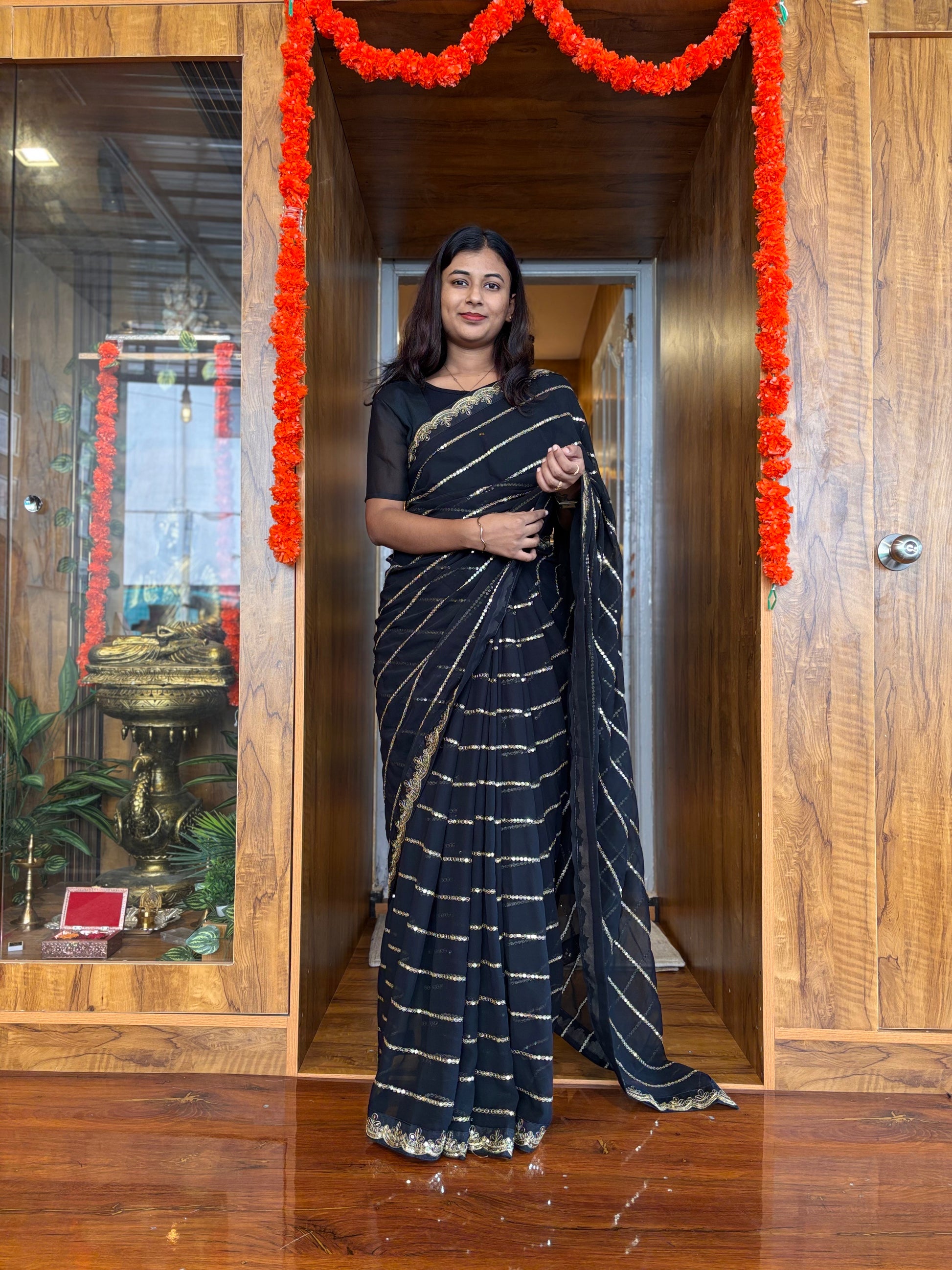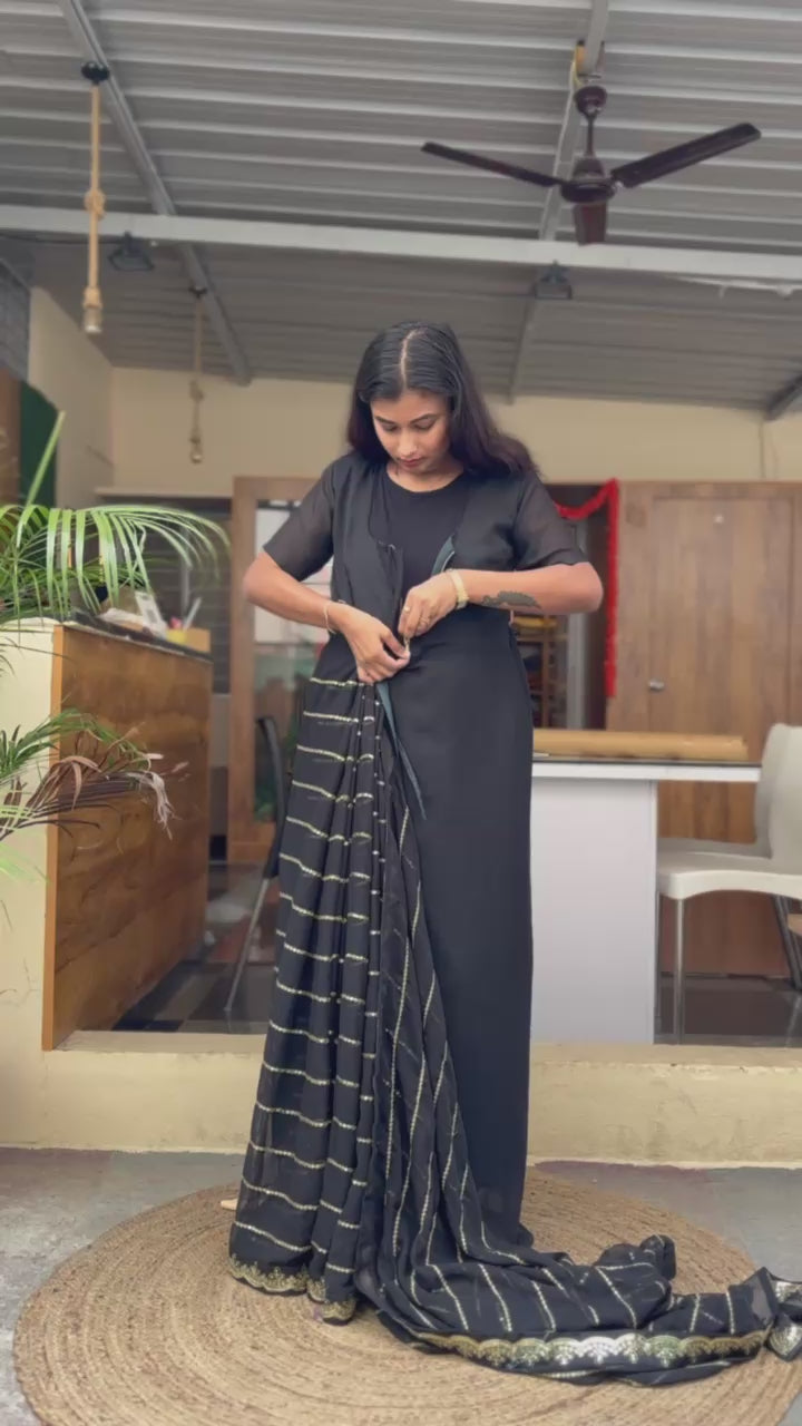 Step into elegance with our revolutionary Zip and Go Saree! This stylish, one-piece wonder features a full lining and a convenient front-opening zipper for effortless draping and ultimate comfort. With its unique twist on traditional attire, this saree is sure to make you stand out from the crowd.