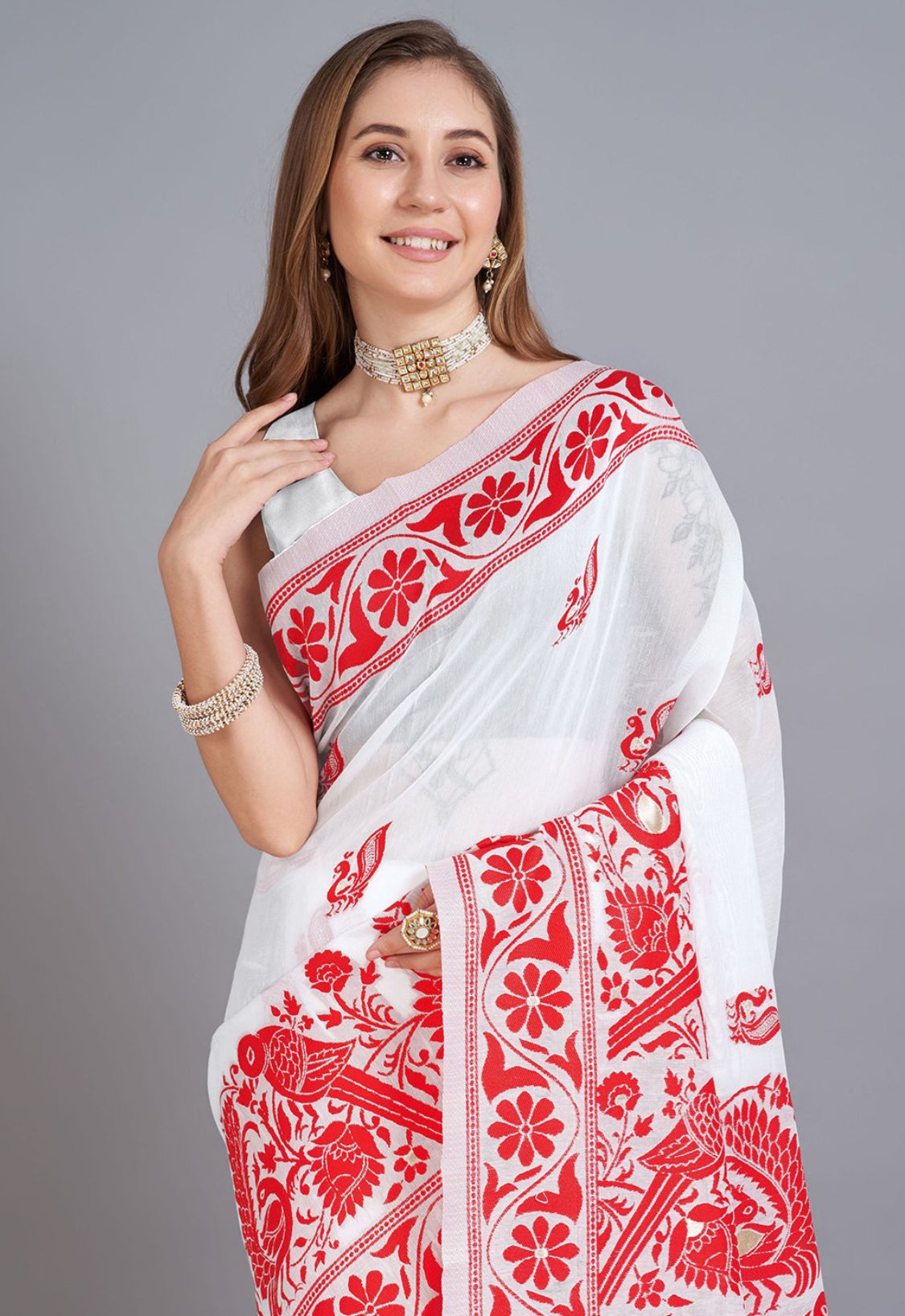 Featuring intricately woven patterns, these sarees embody understated elegance, making them ideal for both everyday wear and special occasions. The fabric is lightweight yet structured, allowing for easy draping while maintaining a graceful silhouette.