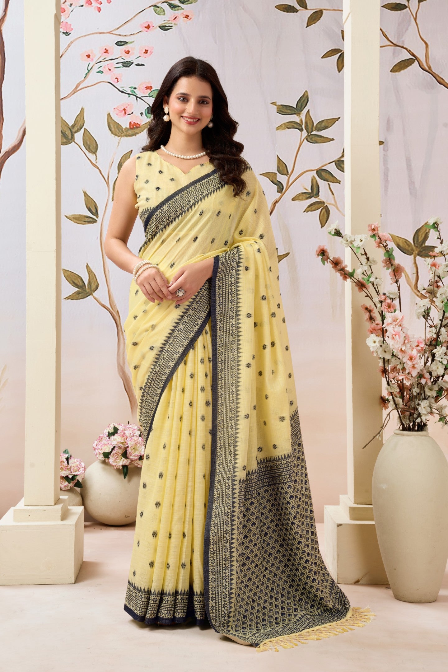 Featuring intricately woven patterns, these sarees embody understated elegance, making them ideal for both everyday wear and special occasions. The fabric is lightweight yet structured, allowing for easy draping while maintaining a graceful silhouette.