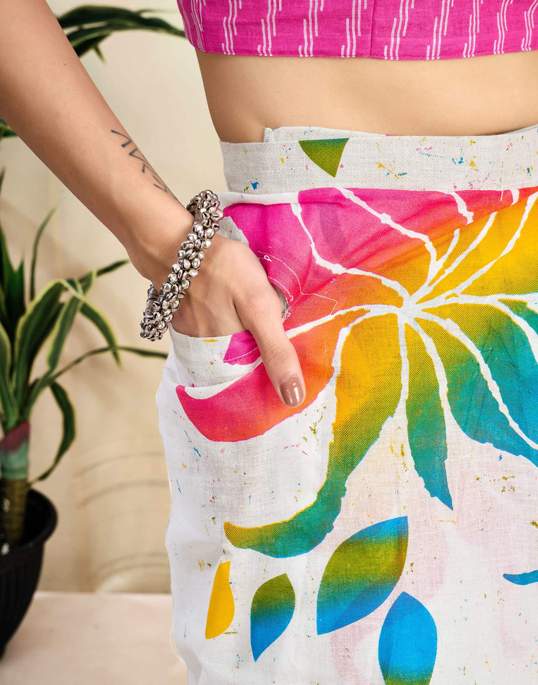 Ready To Wear White Pure Cotton Floral Printed Saree With Pocket
